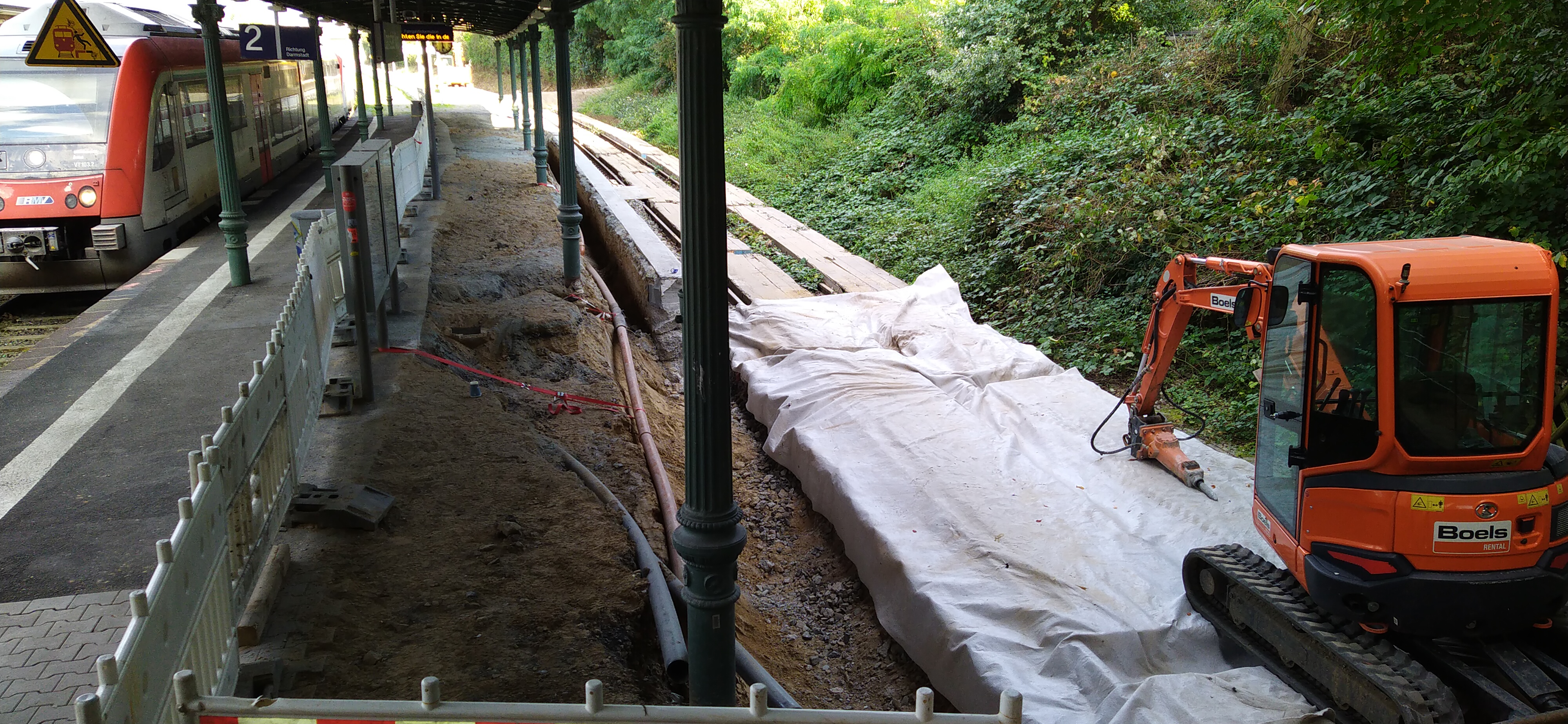 Bild Umbauarbeiten am Bahnsteig Gleis 1-2 mit Zug und Bagger:
