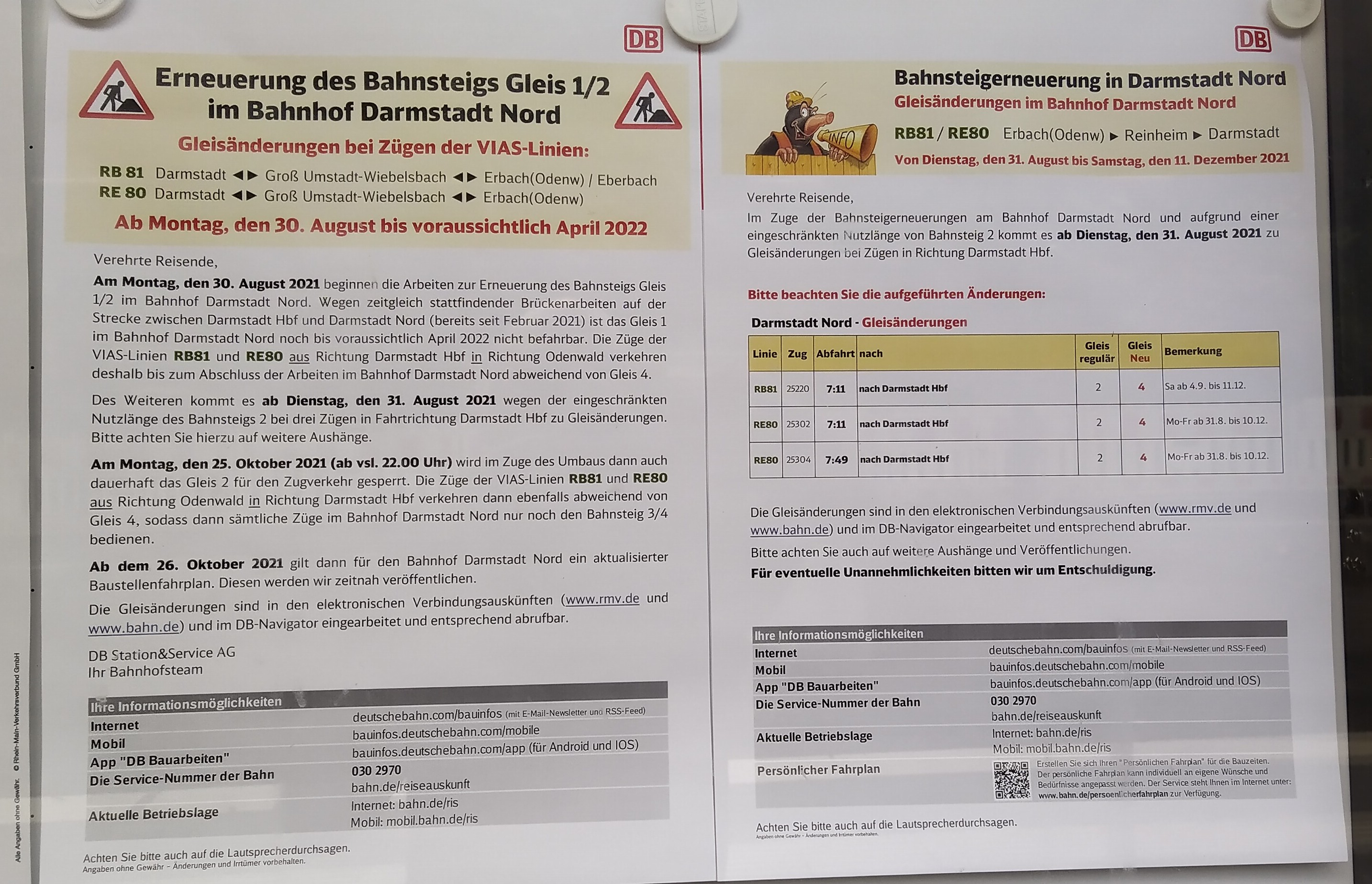 Erfreut ist die Odenwaldbahn-Initiative über die laufenden Arbeiten der Deutschen Bahn (DB) im Darmstädter Nordbahnhof. Bereits seit einigen Wochen laufen die Umbauarbeiten am Bahnsteig der Odenwald-Gleise 1 und 2, die Fertigstellung ist im Frühling 2022 vorgesehen. Von der Stadt Darmstadt wünscht die Odenwaldbahn-Initiative wie bereits beim Umbau des Bahnsteigs an Gleis 3/4 im Sommer 2019 -, endlich den Umbau des Vorplatzes und die Straßenbahn-Haltestelle anzugehen und mit der DB barrierefreie Übergänge mit Lift zwischen Bahnsteigen, Vorplatz, Bus und Straßenbahn anzupacken. Dies ist schon seit Jahren überfällig, ebenso der lückenfreie, tägliche Halbstundentakt nach Aschaffenburg, Erbach, Wiesbaden und Pfungstadt dieser wird durch die zunehmende Parkraumbewirtschaftung z. B. fürs Klinikpersonal immer dringender.